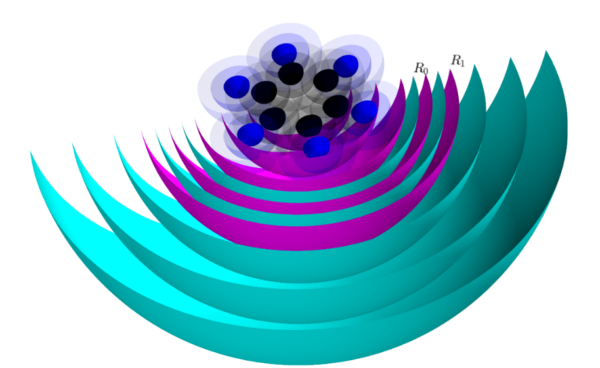 Figure 2: Illustration of the XCHEM basis architecture in benzene. Cyan: B-splines, mangenta: Gaussians at the center of mass of the molecule, blue and black: Gaussians at the atomic sites not overlapping with B-splines.